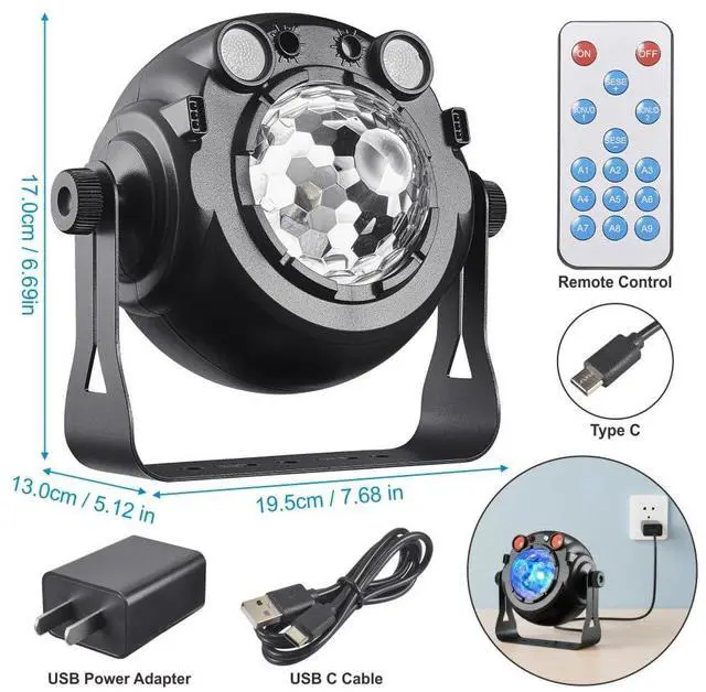 Disco Ball Party LightsEyeshot 5-in-1 party lights features a multi-color rotating disco ball, two RGB+UV wash par lights, and two dynamic pattern beam lights. This vibrant combination instantly transforms any spacefrom home parties and DJ stages to dance floorsinto an electrifying visual experience.