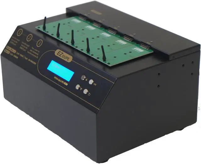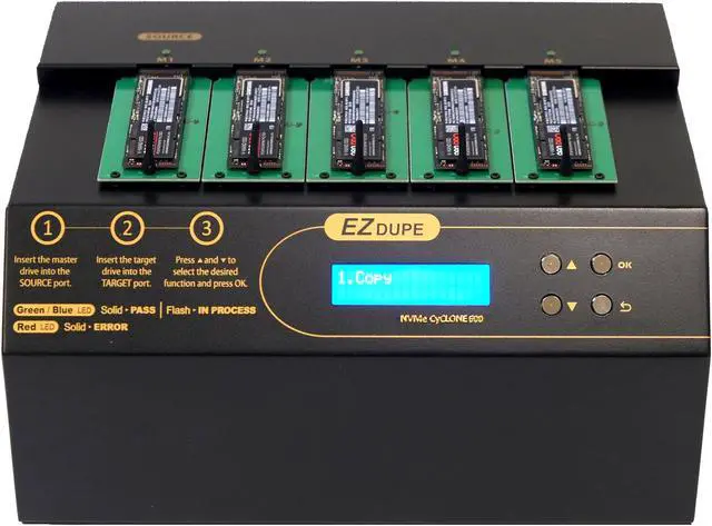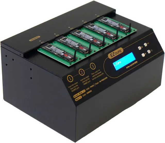 Copy information onto multiple drive formats simultaneously with the 1 to 4 M. 2 PCIe NVMe / SATA SSD Duplicator and Sanitizer from EZ Dupe. Designed to deploy files across multiple M. 2-based drives efficiently, this duplicator gives you the ability to copy up to Four M. 2 NVMe solid-state drives simultaneously with a single press of a button.