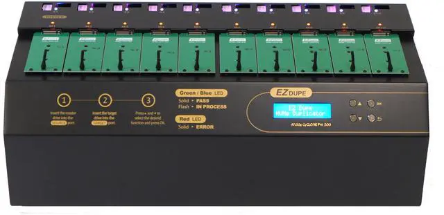 When a bad M.2 NVMe stalled or decreased speed during the duplication copy process, the duplicator will automatically reject the stalled M.2 NVMe and the max copy speed will increase for the remaining copy slots. Indication alert will signal to user to remove bad M.2 media or Hard Drive to maintain maximum copy speed for the remaining copy slots.
