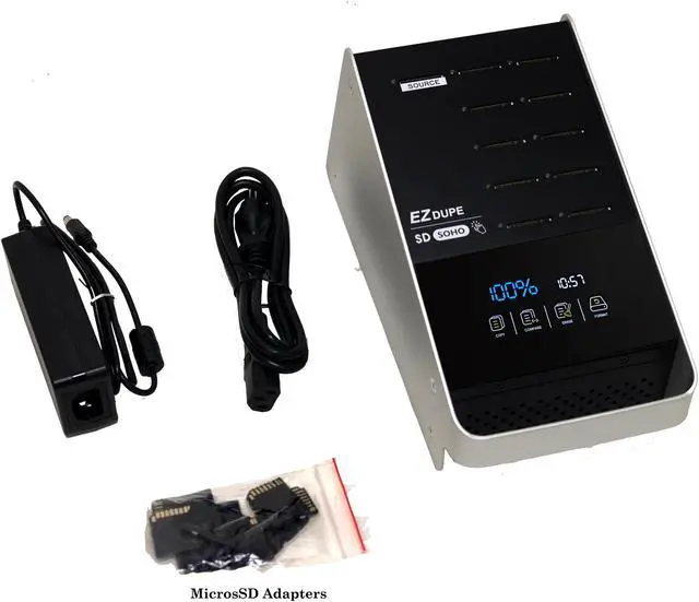 | Touch Screen Menu | Easy to use Touch Screen Menu for 1 slot for source and 10 slots for Micro SD and SD copies (adapter will be provided for MicroSD to be inserted on SD slots) |