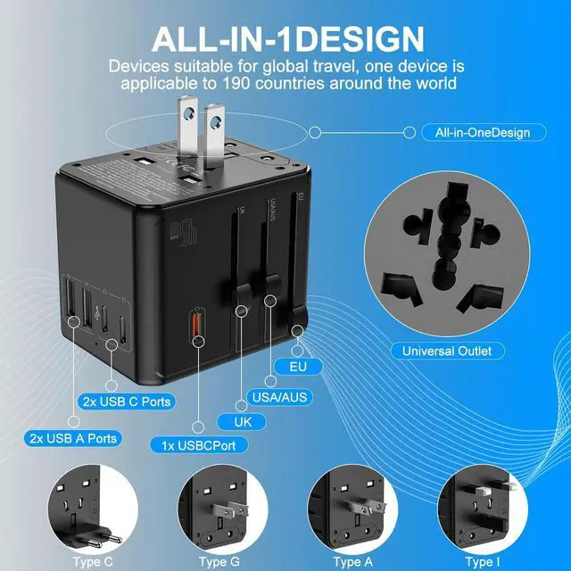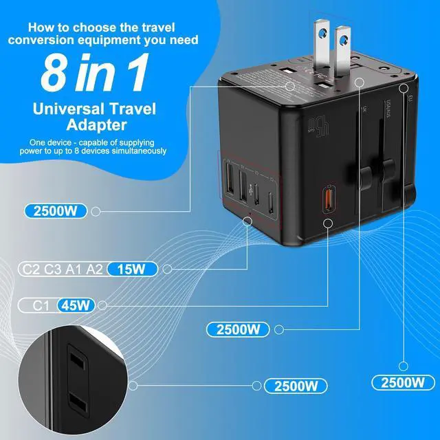 1. Global Travel Companion Works in 150+ Countries & Supports 2500W High-Power Devices Say goodbye to plug compatibility issues. This universal travel adapter is designed for international travelers, covering outlets in over 150 countries across Europe, Asia, North America, and more. With support for high-power appliances up to 2500W, you can safely use hair dryers, electric kettles, and travel irons abroadno need to worry about power limits.