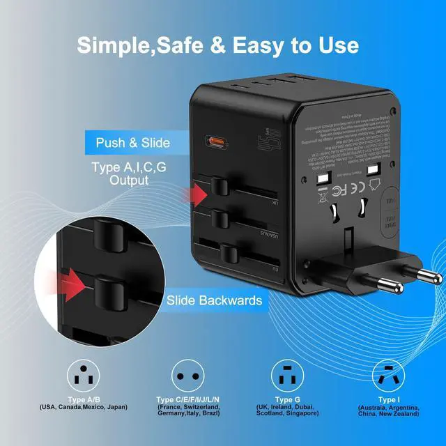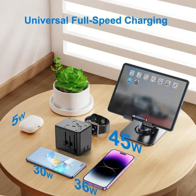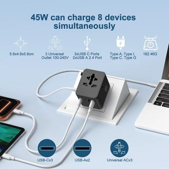 3. 45W PD Fast Charging 3 USB-C + 2 USB-A Ports Charge up to 8 devices at once with the built-in 45W Power Delivery (PD) technology. The 3 USB-C ports provide high-speed charging for smartphones, tablets, and even laptops (MacBook, Dell XPS, etc.), while the 2 USB-A ports offer standard charging for older devices. No more fighting over outletsyour travel charging station is here.