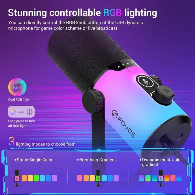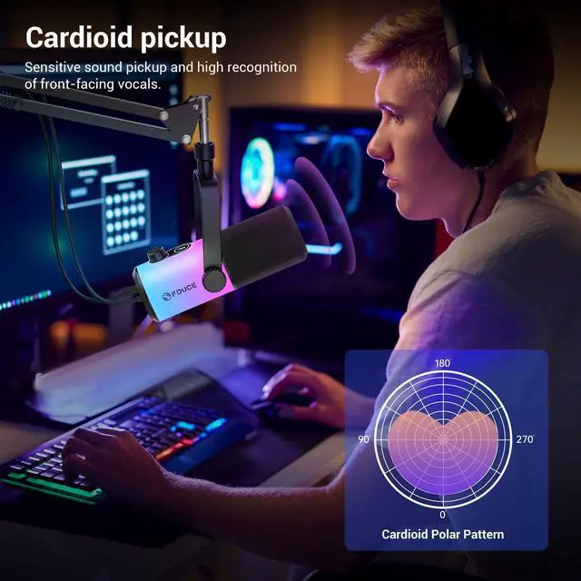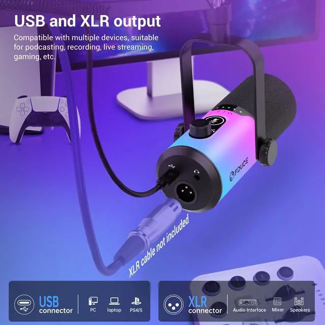 FDUCE Dynamic Gaming Microphone kit, USB/XLR Podcast Computer Microphone with Boom arm Stand, RGB Light, Mute Button and Headphone Jack, for Gamer Streaming Recording Studio YouTube Online Chat(D20+)