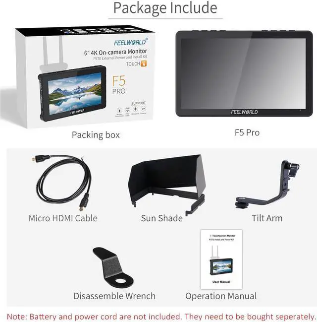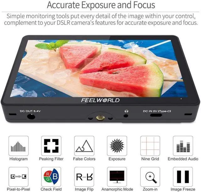 The FEELWORLD F5 Pro V4 is an ideal camera-top monitor for DSLR and mirrorless camera shooters. Because the F5 Pro V4 provides auxiliary power out; allowing shooters to power their cameras. With a battery adapter cable (Optional), the F5 Pro V4 extends camera run-time, while providing a more usable display.