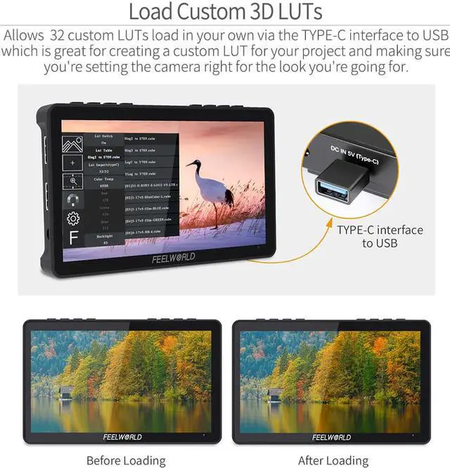 ome cameras can output logarithmic colors pace to preserve the dynamic range, which is great for later post production, however when these files are viewed on a monitor they can look flat and washed out. 3D LUTs solve this problem because they allow you to apply a "look" to the monitor so you get an idea of how the finished images will look like when editing. You could use 4 built-in LOG to Rec.709 video or upload .cube files ( A single file must not exceed 7.9M, supports files with LUT_3D_SIZE of 16, 17, 32, 33, 64, 65.). F5 Pro V4 allows you to load internally up to custom LUTs (Up to 32 user files can be imported), looks or profiles at any time via the TYPE-C interface to USB . Slot and instantly select between them, maintaining creative intent, always.