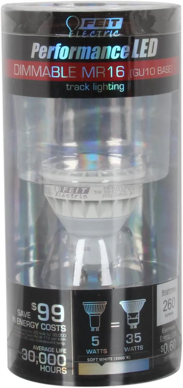 High performanceUp to 260 lumens output and 3000K color temperature make the Feit Electric MR16/GU10/DM/LED LED lamp perfect for most commercial, hospitality and residential retrofit applications. 38-degree beam angle provides uniform illumination.