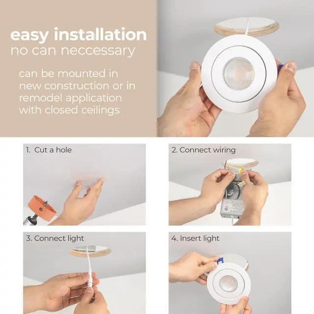Easy installation: No can necessary, this recessed light can be mounted in new construction or in remodel application with closed ceilings