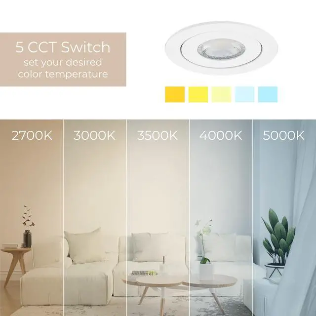 5-CCT Color Temperature Selectability: Choose from 2700K (warm), 3000K (soft white), 3500K (pure white), 4000K (neutral), or 5000K (cool)