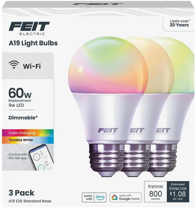 The Feit Electric 60W A19 Smart Wi-Fi Light Bulb provides all the benefits of energy-efficient LED Lighting with the convenience of smart control. Easily turn lights on/off, dim, set groups, timers, schedules, scenes, and automations, it’s all up to you.
