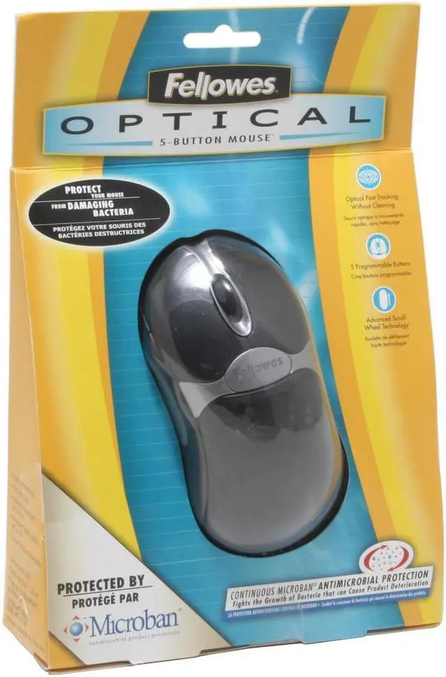 Optical mouse with five buttons offers advanced optical technology for powerful control and accuracy, USB connectivity and built-in Microban antimicrobial protection. Microban fights the uncontrolled growth of damaging microbes, such as bacteria, that can cause product deterioration. The continuous cleaning action helps your input devices remain cleaner for the lifetime of the product. Optical mouse includes five programmable buttons with Fellowes EasyPoint software. Plug-and-play optical mouse is compatible with Windows XP, Vista and Windows 7.