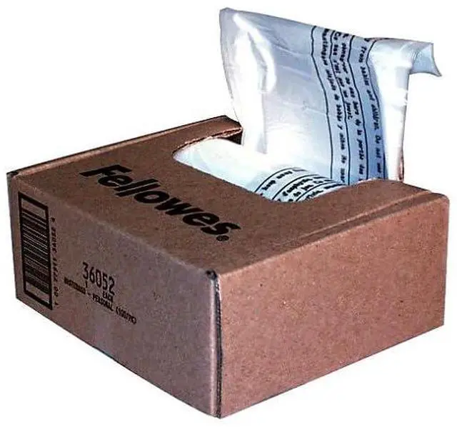 Fellowes shredder waste bags are designed to fit Fellowes® shredder bins. Convenient disposable bags keep work areas clean and make it easy for frequent emptying of shredder bins. Includes easy-to-use dispenser box with extra-long wire ties. 100% recyclable. Perfect for use in the home, office, home office, school, or wherever you shred papers and materials.