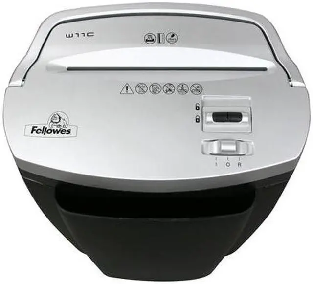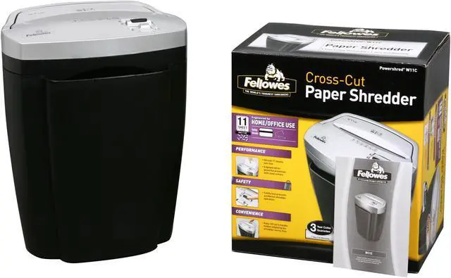 If you're in the market for a paper shredder for your home office, turn to the Fellowes Powershred W11C cross-cut shredder. It can safely shred staples, plastic credit cards and documents so your personal information stays secure. Ideal cross-cut paper shredder for home offices. Shreds 11 sheets per pass into 5/32 x 1-3/8" cross-cut particles at 16' per minute (Security Level P-4). Powershred cross-cut shredder also safely shreds staples and plastic credit cards. Patented SafetyLock disables shredder for added safety protection. 4.75-gallon bin with easy lift-off head and integrated handle for hassle-free waste disposal. Shreds for up to 5 minutes before a 20 minute cool down period is needed. Backed by the manufacturer's 1-year limited product warranty and 3-year limited cutter warranty. Shreds 11 sheets per pass into 5/32" x 1-3/8" cross-cut particles at 16' per minute. (Security Level P-4).|Shreds credit cards and staples.|Patented Safety Lock disables shredder for added safety protection.|Maximum runtime is 5 minutes with a 20-minute cooldown.|Features a 9" wide paper entry, 4-3/4 gallon bin and auto start/stop.