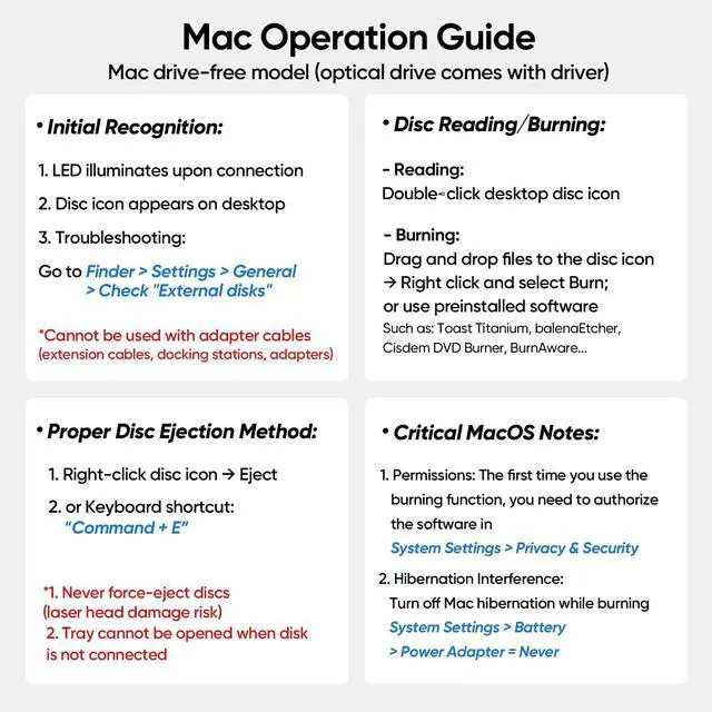 Insert/Eject: Windows: Eject via File Explorer or device button; Mac: Use “File > Eject” or desktop icon right-click (device button disabled).