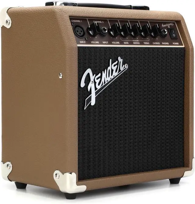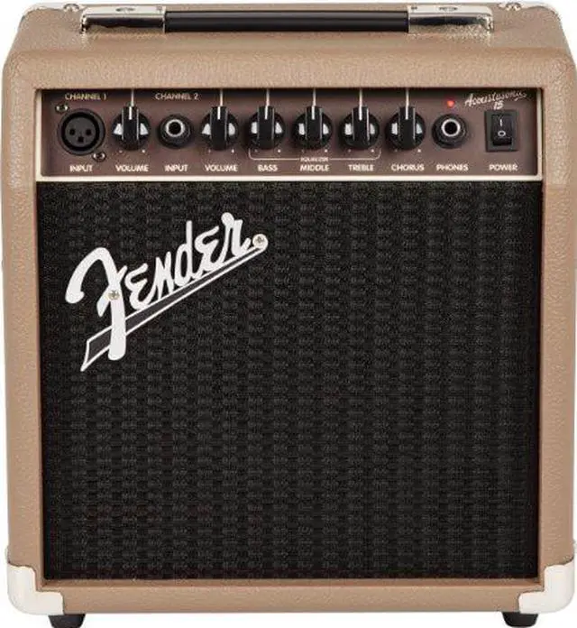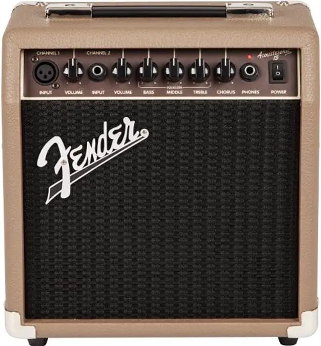 The Fender Acoustasonic 15 combo amp offers portable amplification for acoustic-electric guitar and microphone. It's simple and flexible enough for a variety of musical performance or basic public address. Two channels and chorus effect keep this little combo super flexible. The instrument channel offers Volume, Bass, Middle, Treble and Chorus controls while the mic channel has Volume, Bass, Middle and Treble controls.