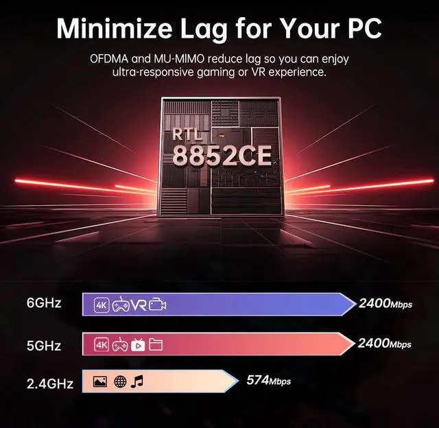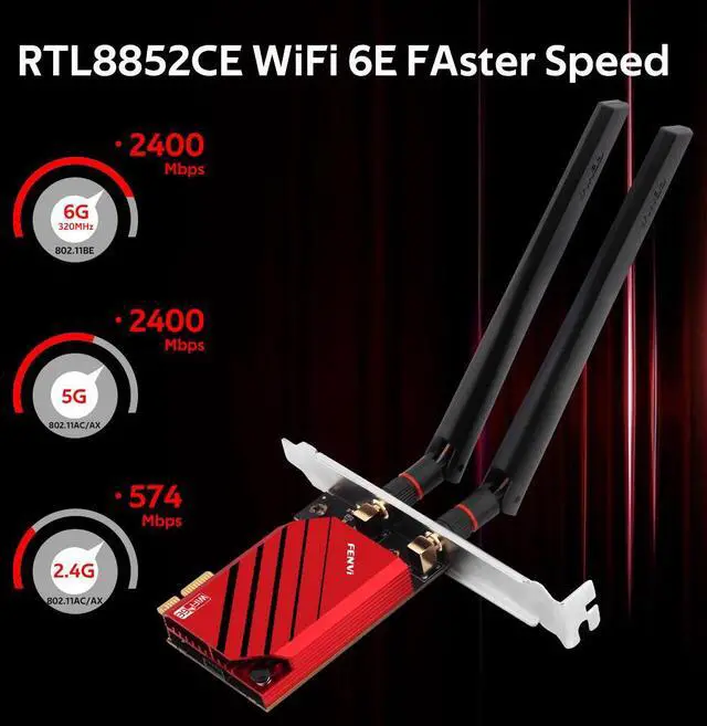 WiFi 6E Standard - With RTL8852CE, Reach incredible speeds up to 2.4 Gbps (2400Mbps in 6GHz, 2400Mbps in 5 GHz or 574 Mbps on 2.4 GHz) with ultra-low latency and uninterrupted connectivity using Wi-Fi 6E technologies.
