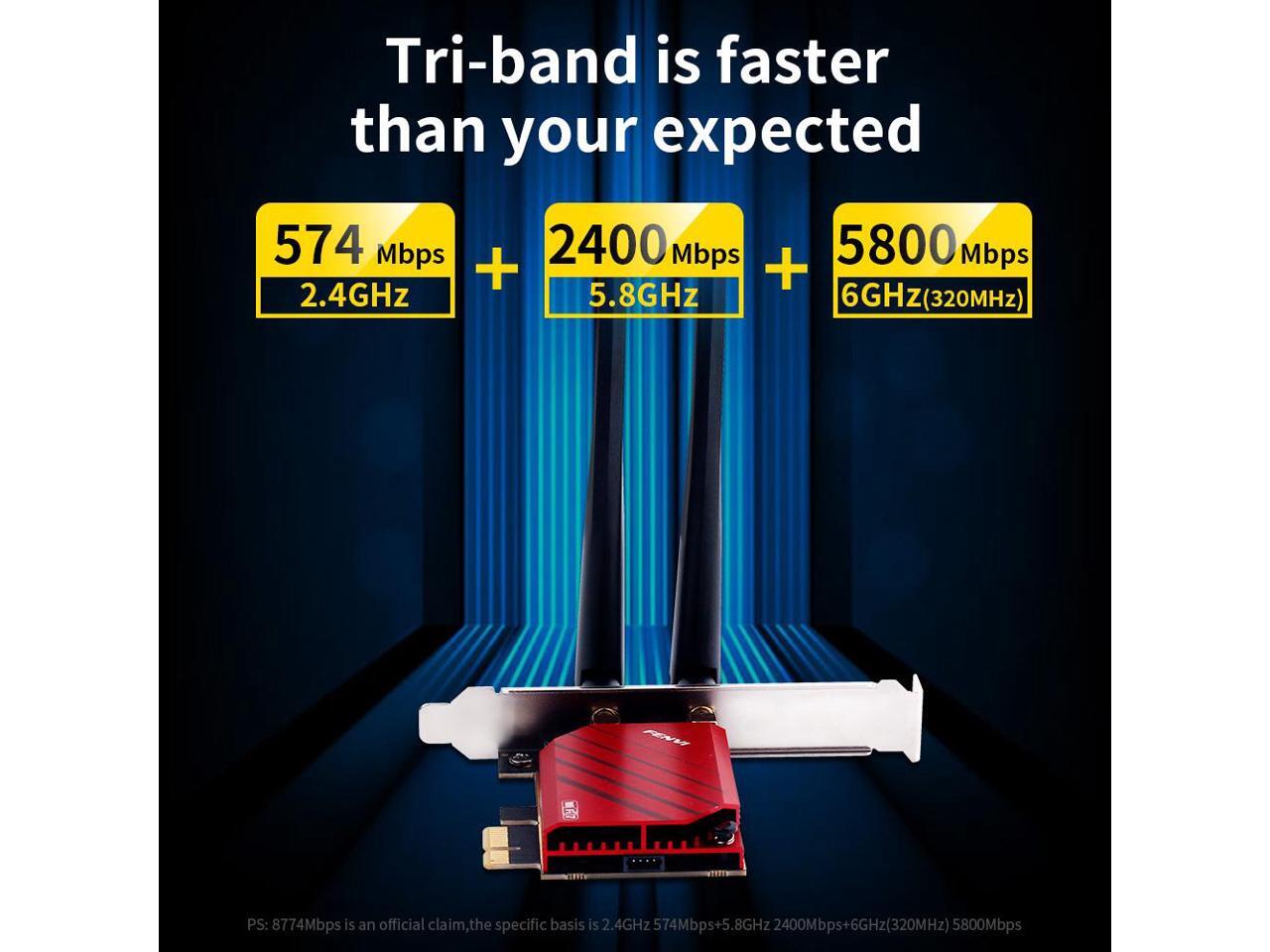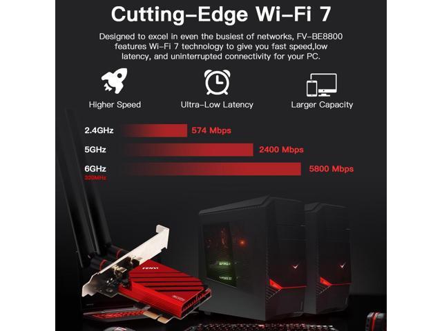 Fenvi WiFi 7 Card Support 6GHz --- The Lastest PCIE WiFi 7 Card Built-in Intel BE200 chipset provides the latest 802.11ax standard technology. Delivers from 80MHz to 160MHz higher peak data rates up to 5.8Gbps, and up to 4X capacity improvement comparing to 802.11ac.