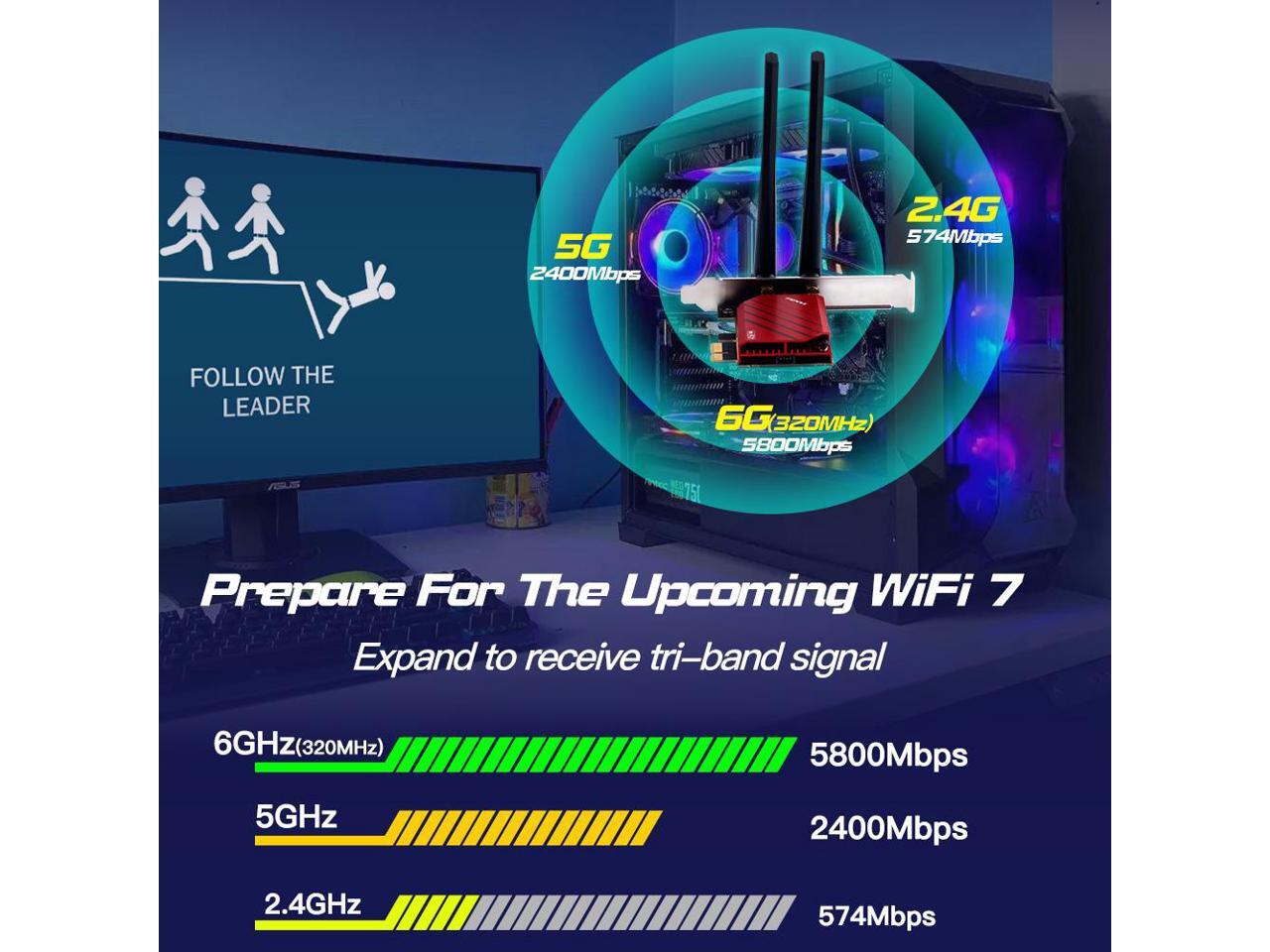 With Intel Wi-Fi 7 Technology --- BE200 WiFi 7(Gig+) has the latest WiFi technology and frequency band resources, which can be compatible with existing WiFi 6 routers and WiFi 6E routers.(6Ghz up to 5800Mbps/ 5Ghz up to 2400Mbps /2.4Ghz up to 600Mbps) .