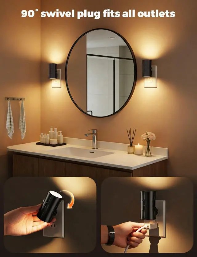 90°Rotatable Plug & Dual-Direction Lighting-- Its unique rotating plug fits both vertical and horizontal outlets, keeping the second socket 100% free. The compact design casts gentle up/down light, illuminating tight spaces like behind furniture or stairways without blocking outlets.