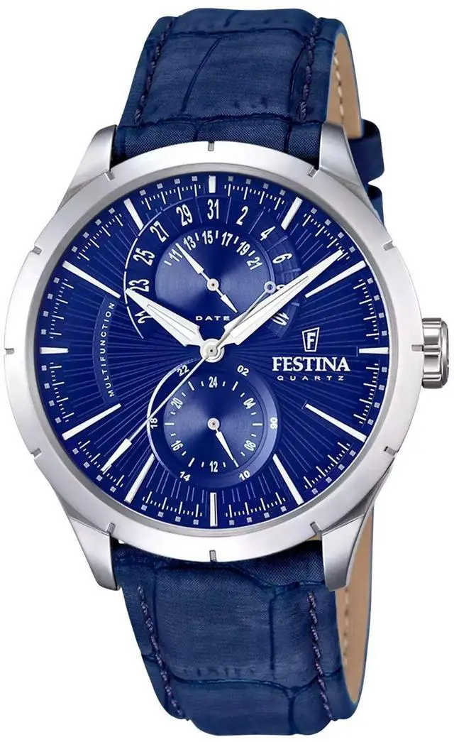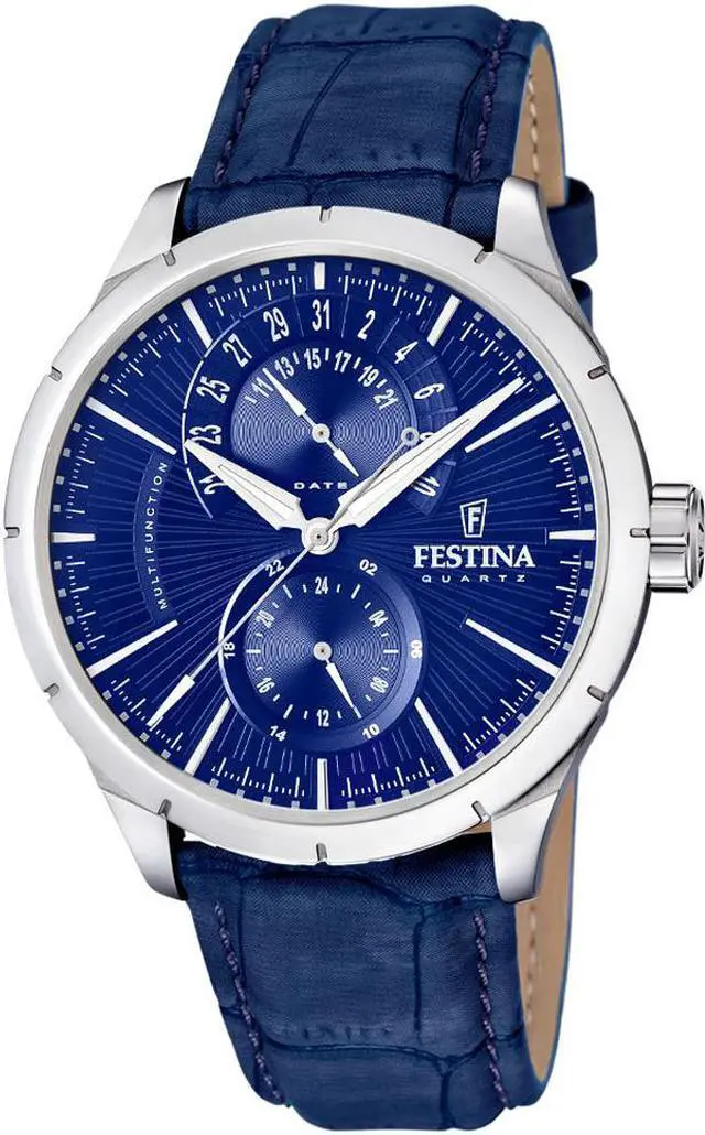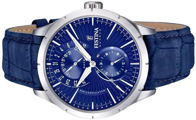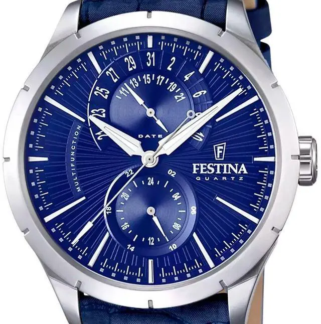 Festina Retro man's watch. This watch combines perfectly blue tones with details in silver. Use the Festina Retro watch daily and don't lose track of time. This watch is made of stainless steel with blue leather strap. Blue dial with silver details. It has calendar and has a water resistance of 50 meters.