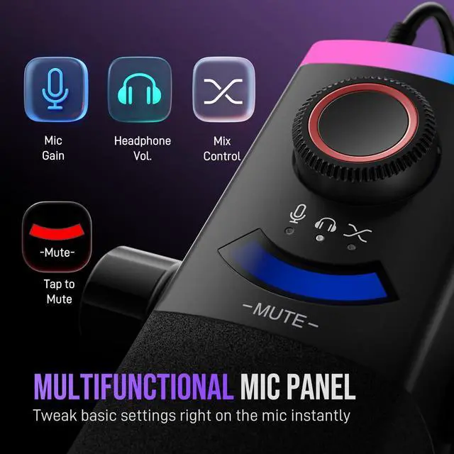The gaming microphone offers XLR audio (48kHz/24bit, 115dB SPL) to capture emotional vocal ranges, boosting live gameplay engagement, with a cardioid pattern and 75dB SNR reducing noise from multiple devices. The gaming equipment also features instant USB-A/C plug-and-play, compatible with MacOS/Windows, PS4/PS5, and laptops, plus tap-to-mute with a visible LED to avoid hot mic moments. Real-time monitoring balances mic and PC audio, while a 3-in-1 knob adjusts gain and headphone volume, ideal for commentary or podcasts. Its vibrant RGB system includes 240+ combos, with beat modes syncing to game soundtracks. The complete dynamic mic kit has a stable 30in boom arm (space-saving), a foam windscreen to eliminate plosives, and an 8.2ft USB cable for neat routing. Perfect for streamers, gamers, and content creators.