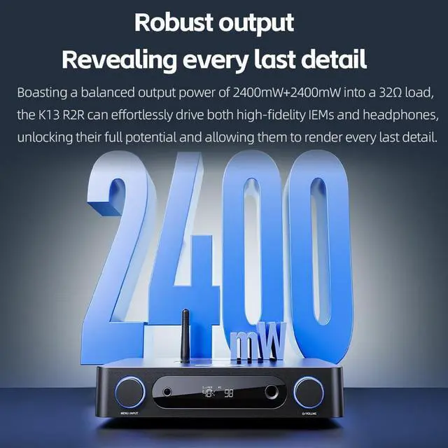 Experience a new level of audio performance with the FiiO K13 R2R, a desktop-class USB DAC and headphone amplifier built for true music enthusiasts. Instead of a standard delta-sigma DAC chip, the K13 R2R uses a custom resistor ladder (R-2R) DAC, converting digital signals through a precision network of resistors. The result is a warmer, smoother, and more natural analog sound that brings your music to life. The K13 R2R offers versatile connectivity with USB-C, optical, coaxial, and Bluetooth digital inputs, plus XLR and dual RCA line outputs for seamless integration into any setup. Two headphone jacks1/4" single-ended and 4.4mm balancedmake it easy to connect everything from studio headphones to high-end audiophile gear. With switchable low, medium, and high gain settings, you can easily match the amplifiers output to your headphones, ensuring clean, powerful sound at any listening level. Whether youre pairing it with a laptop, phone, or home audio system, the FiiO K13 R2R is your perfect bridge to upgraded, high-fidelity sound.