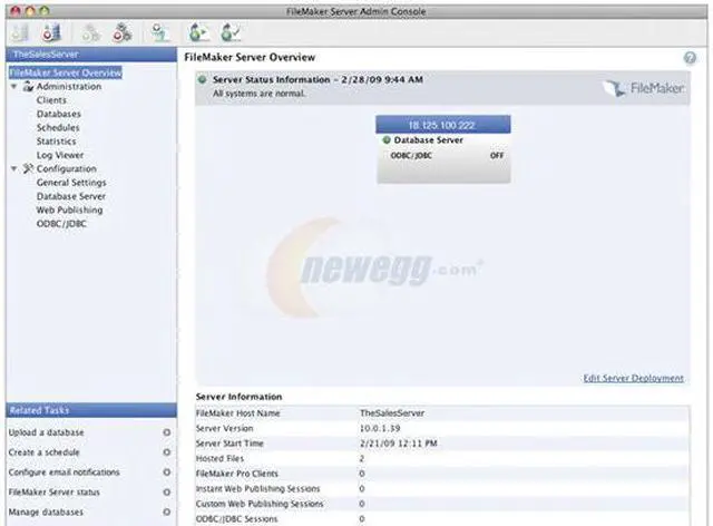 | Feature | Setup & Administration Install and configure in just 20 minutes or less. Manage databases remotely and automate administrative tasks from any computer on the network. Performance & Availability FileMaker Pro databases run faster with FileMaker Server and are accessible 24x7. Schedule automated live backups to ensure data integrity. Security Use SSL encryption for secure data transfer. Manage user access through external authentication via Active Directory/Open Directory. Web Publishing Publish data to the web using PHP or XSLT. Use the PHP Site Assistant for step-by-step guidance in publishing your databases to the web. Import/Export Schedule import and export scripts for automated reporting. Send Mail via SMTP Send Mail via SMTP directly from FileMaker Server 10 for faster distribution; no email client needed. Database Verification Schedule automatic database verification tests to check for consistency and errors. Log Viewer Get a snapshot of your database logs to quickly pinpoint trouble spots. PHP Themes Get 10 new PHP Site Assistant themes to create visually stunning websites in minutes. PHP Preview Use the built-in PHP Preview to look at your websites before publishing them live. Connection Limits Connect up to 999 FileMaker Pro users at the same time – 4x more users than in FileMaker Server 10. Instant Web Publishing Use Instant Web Publishing to easily publish and share databases over the web with 100 simultaneous users – 20x more users than in FileMaker Pro. ODBC/JDBC Connectivity Share data with other applications via server-based ODBC/JDBC support. ODBC/JDBC clients can submit SQL queries to FileMaker databases. |