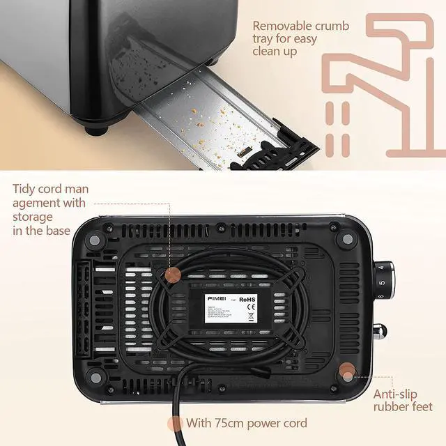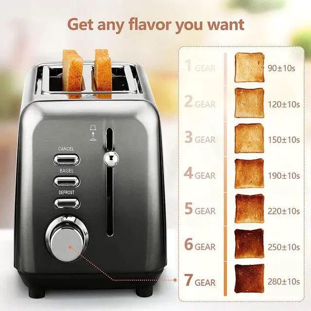 - Choosing from lightly golden to deep dark toasted slice from 1 to 7 gear accommodated by individual preferences.