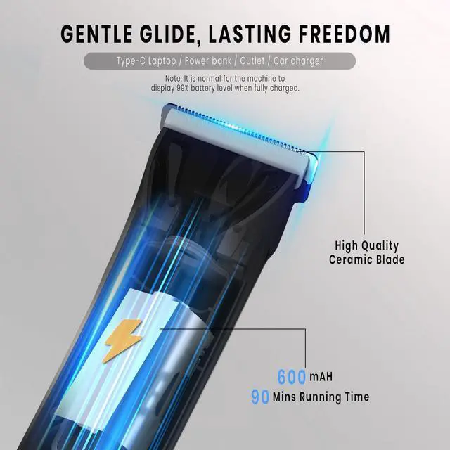 USB-C Rechargeable + LED Features: 1.5h fast charge powers 100min of use (built-in lithium battery). LED battery indicator tracks power levels; built-in LED boosts visibility in low light for precise shaving.