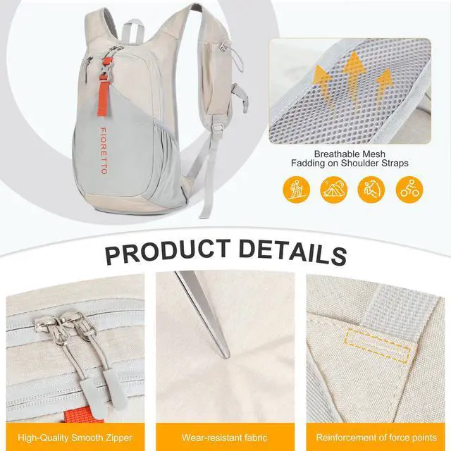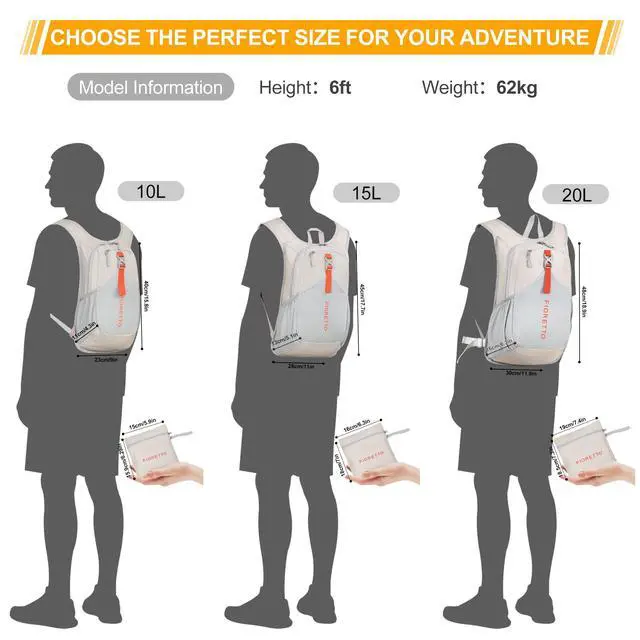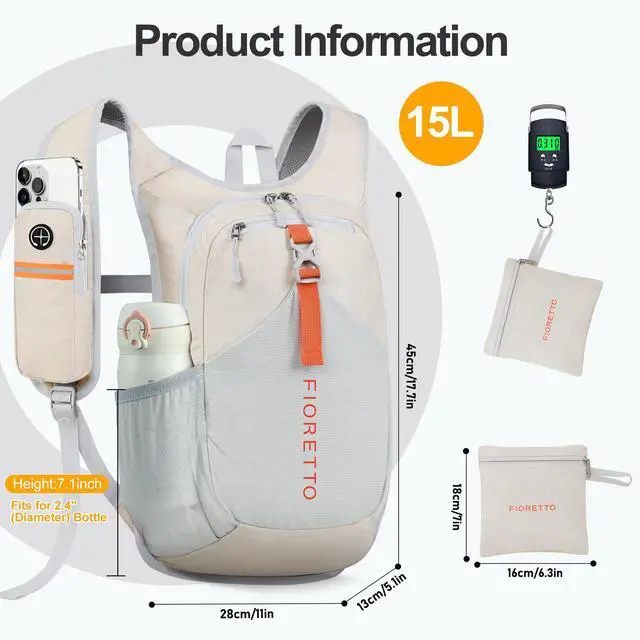 Compact & Hiking Backpack: FIORETTO packable mini backpack measures 17.7" H x 11" L x 5.1" W (45x28x13cm) and weighs just 10.95oz, offering a 15L capacity ideal for minimalist adventurers, day trips, and hiking, or daily commuters. Slip it into luggage as a lightweight backpack or wear it solo for hands-free travel. Always verify that the dimensions match your needs before purchasing.