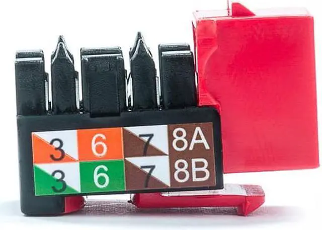 The Cat5 jack provided by us comes with a standard RJ45 plug on the outside. While on the inside, wiring slots are in place for a tool required termination. All of our networking keystone jacks have 568A and 568B color codes on the jacks in addition to the easy trouble free 110 style termination.