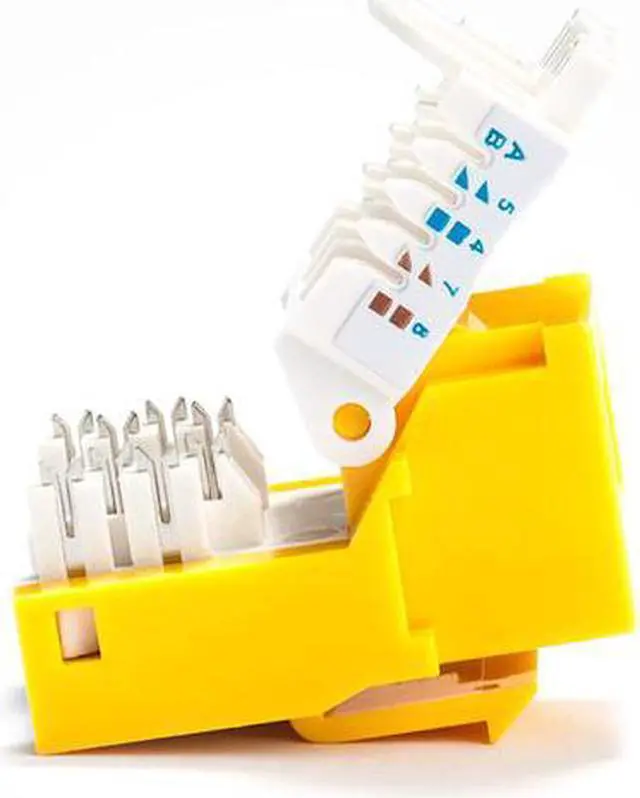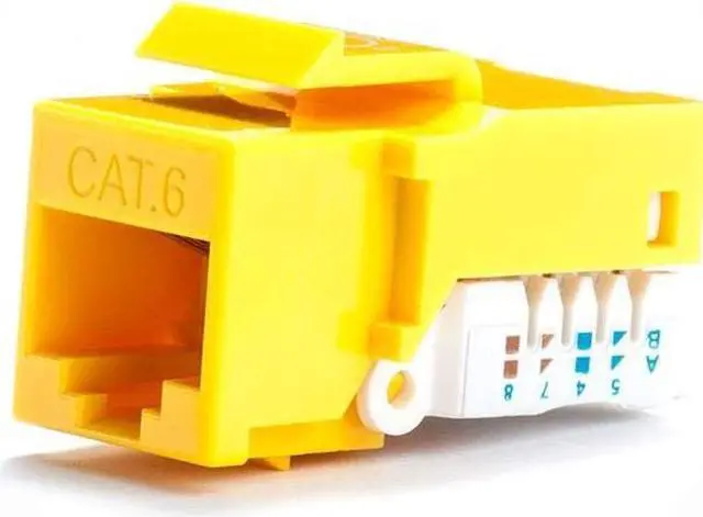 The Cat6 jack provided by us comes with a standard RJ45 plug on the outside. These ethernet jacks are toolless. The unique toolless design does not require the use of a punch down tool. This can make things substantially faster when having to put many of these RJ45 jacks into place. All of our networking keystone jacks have 568A and 568B color codes on the jacks in addition to the easy trouble free termination.