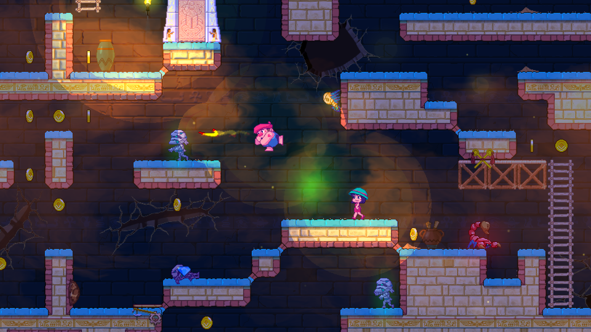 FALLING OUT is a charming, light-hearted and accessible 2D roguelite adventure. Take control of two accidental adventurers, as you explore ancient kingdoms, discover treasures (be careful of the traps!) and bump into the equally lost shopkeeper, Azar. Collect items to craft weird weapons and useful objects that will help you traverse the world in this unplanned escapade. It was supposed to be a relaxing vacation but ditch the itinerary because you'll now need to choose your own path. Navigate through procedurally generated levels that offer the perfect balance of risk and reward. Help Giorgio and Felicie overcome their differences and work as a team in single-player or co-op. However you play, you'll need to work together to conquer the unique obstacles and challenges scattered throughout each world.