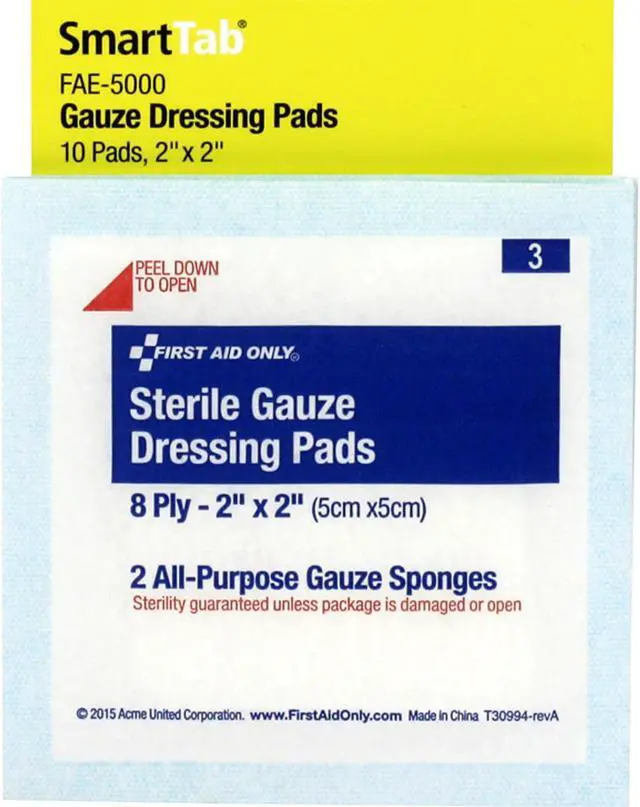 The SmartCompliance refill system for reordering and restocking your First Aid cabinet revolutionizes replenishment. It is quick, easy, and cost effective. As supplies are used, SmartTab ezRefill reminder tabs notify you when it is time to reorder supplies and puts the reorder information at your fingertips. The SmartCompliance Insert Maps also allow you to customize your cabinet to meet your specific first aid needs. SmartCompliance Refill with 10, 2"x2" Sterile Gauze Pads. The 8-ply, 100% gauze pads are perfectly suited for cleaning wounds and applying medication or antiseptic. The non-adherent, all-purpose pads are breathable but also absorbent. This refill is used in First Aid Only SmartCompliance cabinets: 90608, 90580, 90659, 90660, 746000, 746004, 746005, 746006, 90732, 90829, 90830, 90831, 90832, 90833, 90834, 90835, 1000-FAE-0103, 1001-FAE-0103, 1300-FAE-0103 and 1301-FAE-0103.