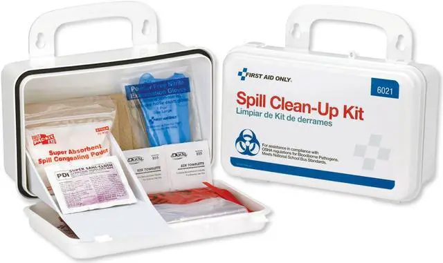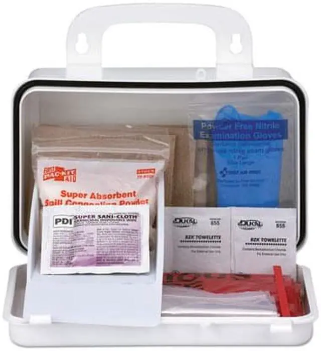 - Package Includes: Absorbent Powder; Biohazard Bag; (2) BZK Antiseptic Wipes; Disinfectant Cloth; (2) Exam Gloves; (10) Paper Towels; Scoop and Spatula; Unmarked Bag