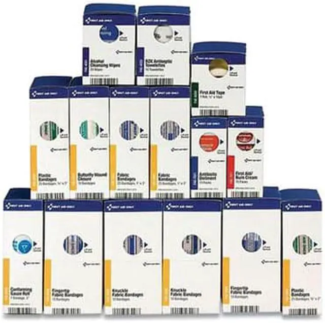 Convenient refills contain individual items for restocking first aid kits. For general use around office or home. For SmartCompliance System. Number of Pieces: 172; For Use With: SmartCompliance General Business Cabinet 1000FAE0103.