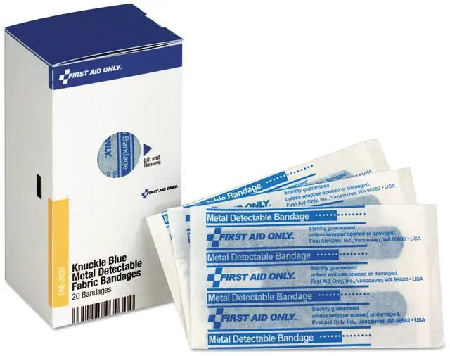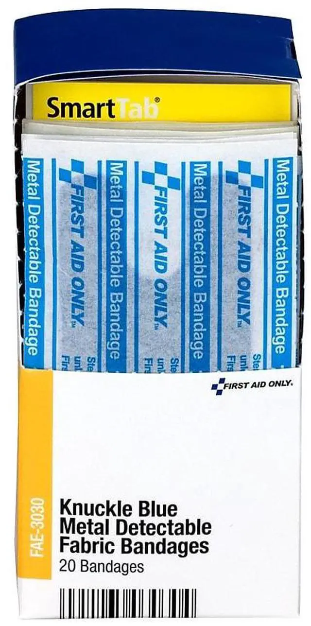 The SmartCompliance refill system for reordering and restocking your First Aid cabinet revolutionizes replenishment. It is quick, easy, and cost effective. As supplies are used, SmartTab ezRefill reminder tabs notify you when it is time to reorder supplies and puts the reorder information at your fingertips. The SmartCompliance Insert Maps also allow you to customize your cabinet to meet your specific first aid needs. SmartCompliance Refill with 20 knuckle blue metal detectable bandages per box. The fabric adhesive bandages are ideal for minor cuts, abrasions and puncture wounds on the knuckles. An internal foil built in to the bandage for quick metal detection makes them the perfect solution for the food or pharmaceutical industries. Made with a pliable woven fabric, each bandage is ventilated to aid in the natural healing process. The flexible fabric is designed to wrap comfortably around the knuckle, stretching when you stretch while the strong adhesive still holds the bandage firmly in place. They effectively protect scrapes and cuts while the non-stick pad absorbs drainage. The breathable backing repels water and dirt. This refill is used in First Aid Only SmartCompliance cabinets: 90659, 90660, 746005, 746006, 90830, 90831, 90834, 90835, 1300-FAE-0103, 1301-FAE-0103 and 1350-FAE-0103.