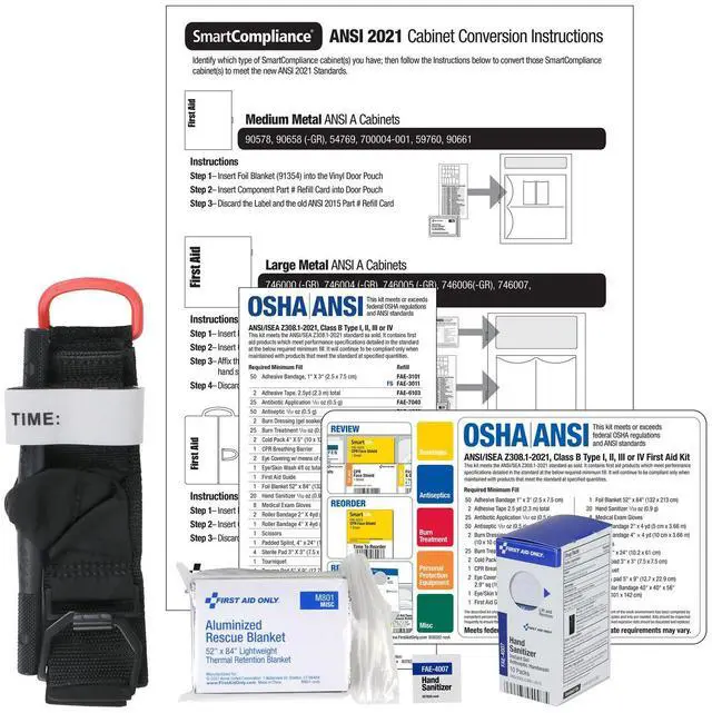 • Contains: (1) Windlass Tourniquet; (1) Emergency Blanket; (10) Hand Sanitizers; (1) ANSI B 2021 Requirements Label; (1) ANSI B 2021 Contents Card; (1) Replacement Label for Schematic for Hand Sanitizer Conversion Instructions