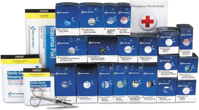 - Package Includes: (1) First Aid Guide; (10) Patch Plastic Bandages, 1 1/2" x 1 1/2"; (25) Adhesive Fabric Bandages, 1" x 3"; (25) Adhesive Plastic Bandages, 3/4" x 3"; (10) Fingertip Fabric Bandages; (20) Alcohol Wipes; (10) BZK Antiseptic Towelettes; (10) Hand Sanitizer Packets; (10) Sterile Gauze Pads, 2" x 2"; (10) Sterile Gauze Pads, 3" x 3"; (2) First Aid Tape, 1/2" x 5 yd and Gauze Roll, 2" x 4 yd; (1) Triangular Bandage, 40" x 40" x 56"; (1) Cold Pack, 4" x 5"; (3) CPR Mask and Pair Nitrile Gloves; (4) Nitrile Exam Gloves; (2) Sterile Eye Pads (1) 1 oz Eyewash; (1) 1/2" x 5 yd Tape Roll; (2) Trauma Pads, 5" x 9"; (20) Aspirin Tablets; (20) Non-Aspirin Tablets; (10) Burn Cream Packets; (1) Burn Dressing, 4" x 4"; (20) Ibuprofen Tablets; (1) Antibiotic Ointment Packet; (1) Forceps; (1) Scissors