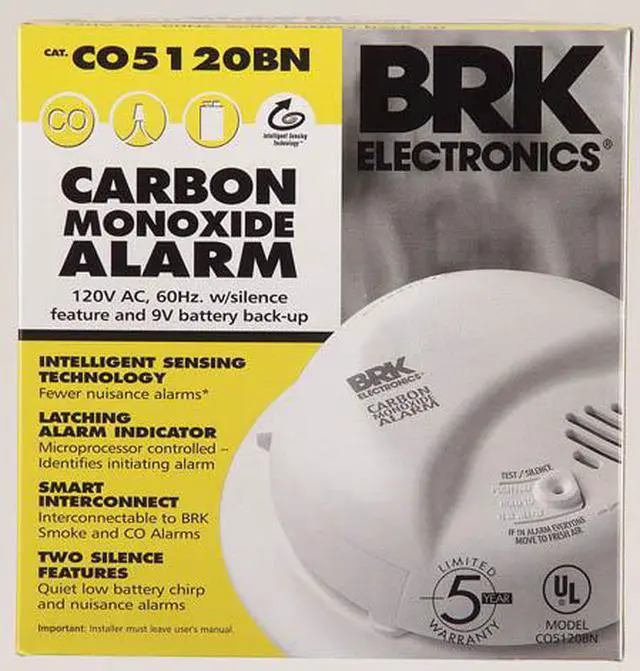 First Alert Hardwired Carbon Monoxide Alarm - First Alert hardwired carbon monoxide detector with battery back-up. Features an electrochemical sensor which detects carbon monoxide gas and measures the concentration. Sounds a loud 85 decibel alarm when potentially harmful level is reached. 2 silent features; unwanted alarms and low battery silence. Instant test/reset button. 9-volt battery included. Battery life varies according to use and application. Recommended for professional installation only. UL (Underwriter's Laboratories) listed. White. - Type: Hardwired, Voltage: 120V, Battery Life: Varies According To Battery Life, Sensor Type: Electrochemical, Dimensions: 5-3/5 In. W x 1-9/10 In. H x 5-3/5 In. L, Battery Back-Up: Yes, Alarm Type: Carbon Monoxide, Decibel Level: 85dB, Battery Type: 9V Battery, Batteries Included: Yes, Color: White, UL Listed: Yes, Warranty: 7-Year Limited, Pkg Qty: 1, Package Type: Box