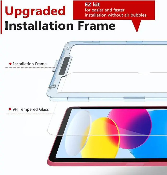 Installation Frame: Contains an innovative installation alignment frame for efficient bubble-free installation without any experience. The strong adsorption and automatic exhaust function of iPad a16 screen protector makes the installation easier and faster. Please read the instructions or watch the installation video carefully before installation.