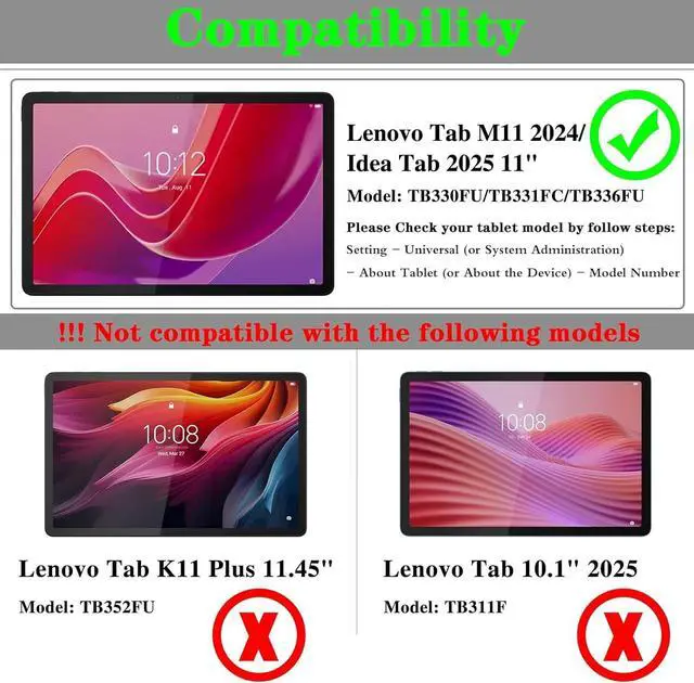 ? Only for Tab M11 (2024) Tablet TB330FU / Tab K11 (2024) TB331FC / Idea Tab (2025) TB336FU 11 inch.? Sensitive touching performance make your device function smoothly and work fast.? 9H hardness new screen protector can protect your device against dirt dust and scratches by keys or other hard items.? High Definition with 99.9 % transparency to allow an optimal natural viewing experience.? Easy Install And Perfect Fit No Residue When Removed.