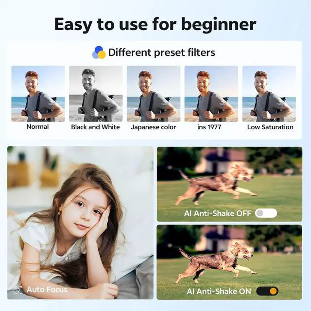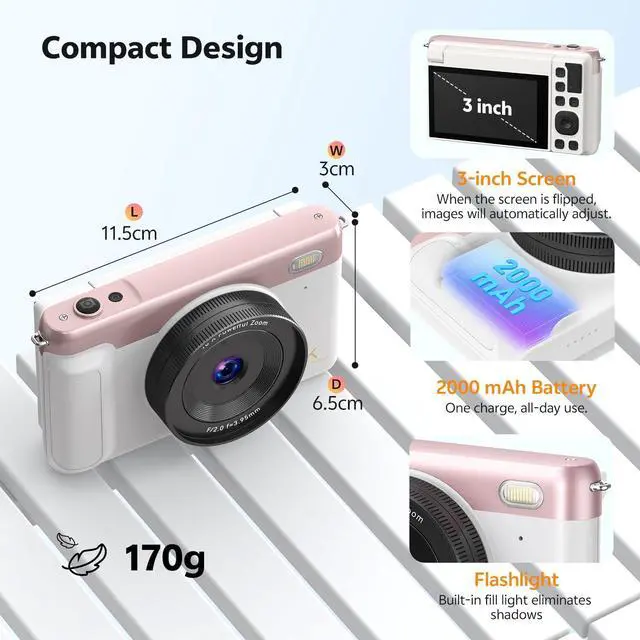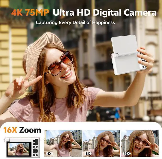 | Special Feature | 4K Ultra HD Camera, Autofocus, 180° Flip Screen, 16xDigital Zoom, Video Recording And Pause, Webcam For Live Stream and Vlogging, LED Fill Light, Recording While Charging, Anti-Shake, Flashlight, Date Stamp, Time Lapse, Slow Motion, Selfie, Beauty Face, Continuous Shooting, Self-Timer, Smile Detection, Auto Off, 2 Rechargeable Batteries, Compact and Portable |