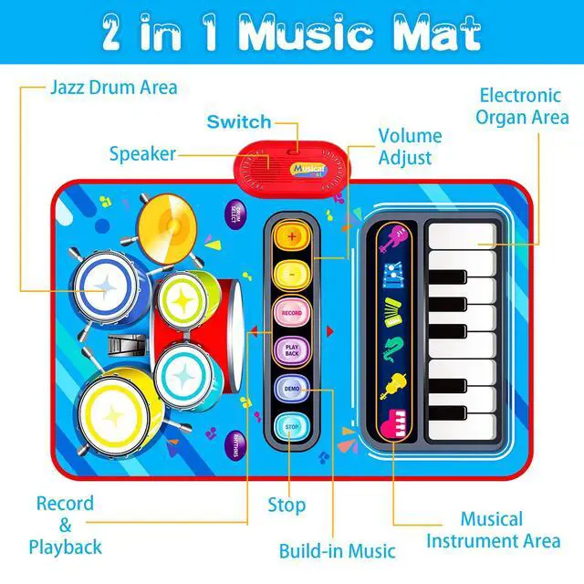 This piano play mat can be touching and stepping on, hitting by the sticks, improves kid's hand-feet coordination at early age. Parents can play music pads with their babies to increase parent-child interaction and enjoy easy parent-child time. Ideal baby musical toys for 1 year old 2-3 year old. First birthday gifts for boys girls, baby 1st birthday presents.