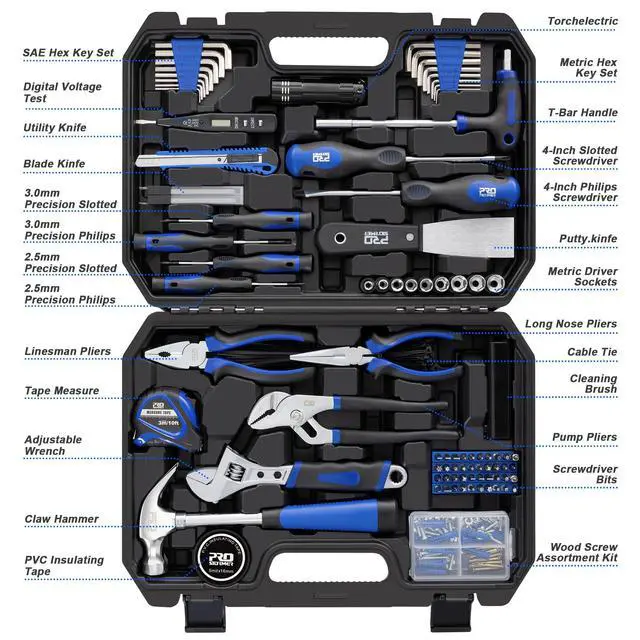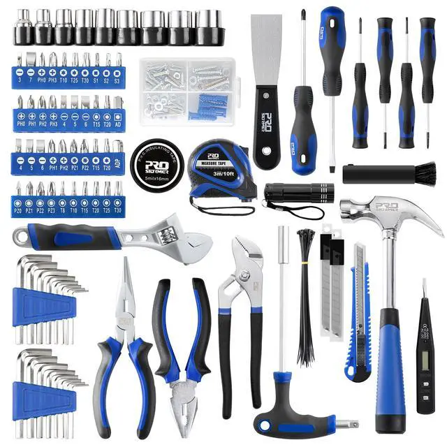 Prostormer 229pcs Hand Tool Set is an all-in-one toolkit designed to tackle most DIY projects or repair works. With versatile applications ranging from automotive repairs to home renovation, this comprehensive set includes almost everything you need to get the job done right. These tools are made from durable carbon steel with corrosion-resistant chrome finish to provide durability and extended tool life. All tools organized in a sturdy blow-molded toolbox to easily transport from place to place.