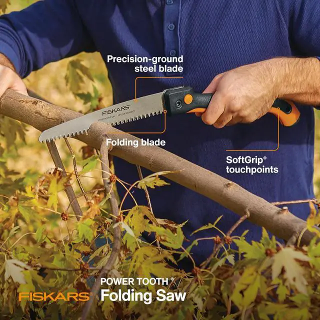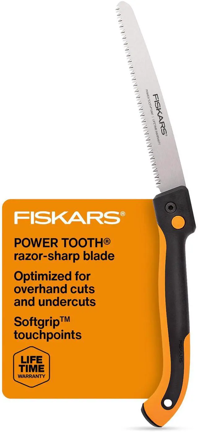 INCLUDES: 1 10-Inch Fiskars Power Tooth Folding Saw with hang hole; Non-slip grip handle boosts power and control; Backed by a lifetime warranty