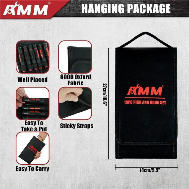 The pick and hook set is made of heat-treated chromium-vanadium steel, with black phosphate surface treatment, high torque, high hardness, and not easy to rust.