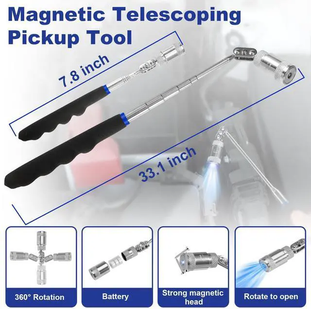 - Freely adjustable length as required, the retractable magnetic tool handle extends from 7.8 inches to 33 inches with a flexible 360-degree bend in the magnetic head.