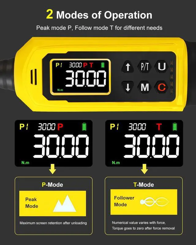 1. Precise & Versatile 5-Unit Display:Digital torque wrench with full-color LCD screen displays 4265.6 in.lbs range and switches between 5 units (in.lbs, ft.lbs, Nm, kgf.cm, kg.m), ideal for bicycle, automotive, and home repair applications requiring accurate torque control.