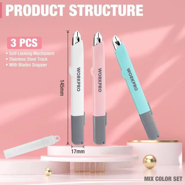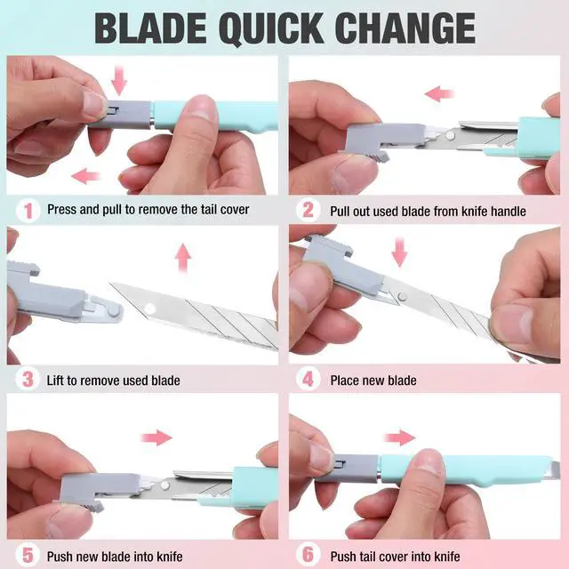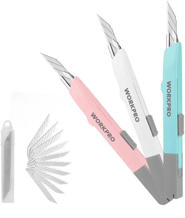 Retractable Blade & Auto-lock : The multiple locking grooves allow a free control of blade length with sharp precision. The blade automatically locked when free the button and easily retracts to lock safely within the metal frame when finished using. Razor blade replacement is easy with the quick-release retail. Includes 10 extra blades.