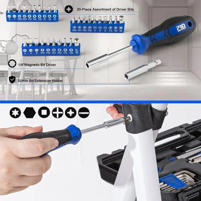 Prostormer 160-piece tools kit contains all the basic but necessary tools you will need around your home to assemble furniture, install hang picture frame, diy some interesting items, repair simple home appliance, and a lot more. These tools are made from durable carbon steel with corrosion-resistant satin chrome finish to provide durability and extended tool life. It is great starter tool kit to have at home, garage, workshop, office, dormitory. This tool set is also a wonderful gift choice for family member, friends, partners, etc.